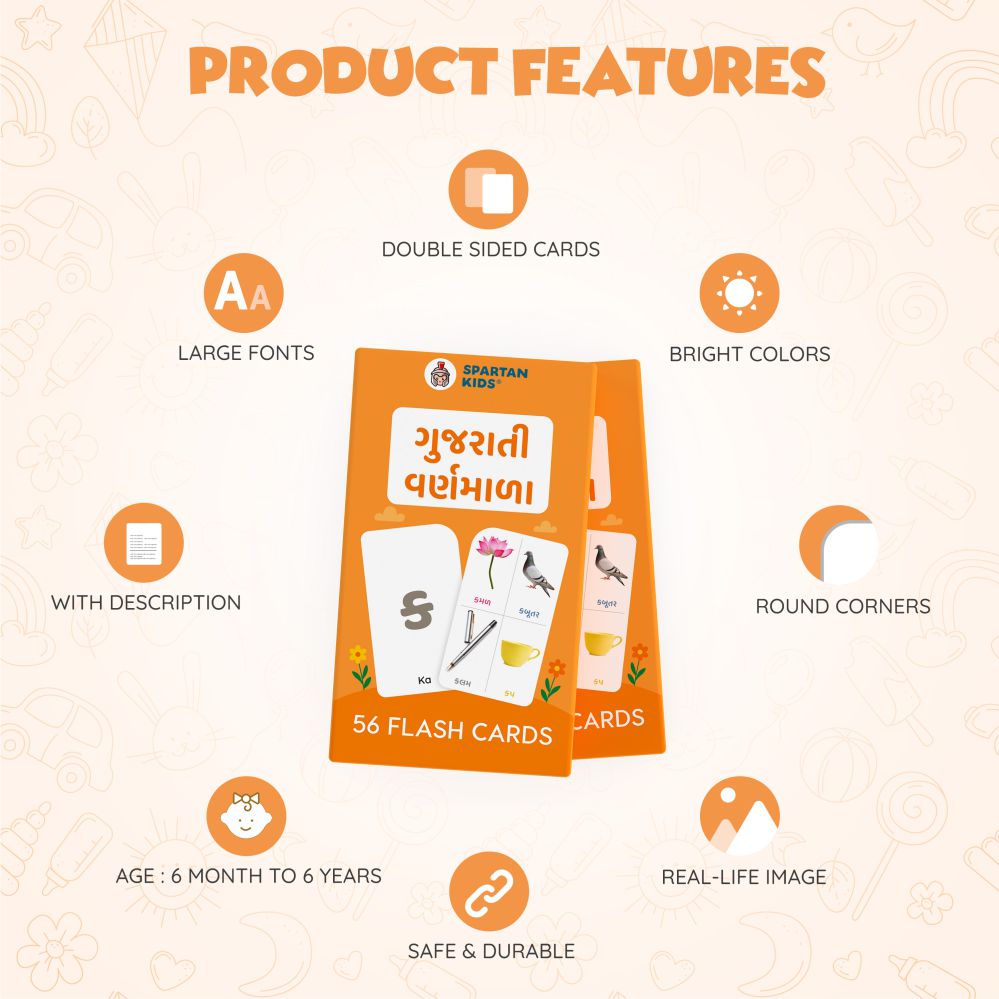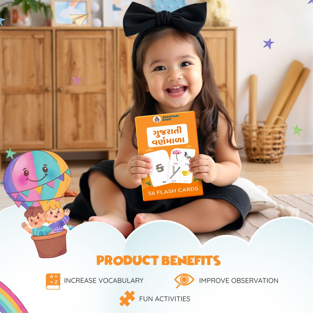 Embark on a vibrant journey through the Gujarati language with this premium set of 56 double-sided Varnamala flashcards, designed for children from 6 months to 6 years. Each card showcases large, clear Gujarati fonts, stunning real-life images of Indian objects, animals, and cultural icons (such as a mango for 'મ' or an elephant for 'હ'), and bright colors to spark young imaginations. The front presents a letter paired with a vivid image, while the back provides pronunciation, meanings, and simple sentences to foster bilingual proficiency. Crafted from durable, non-toxic, tear-resistant cardstock with rounded corners for safety, these 13.5 x 7.8 cm cards are ideal for little hands, promoting fine motor skills and easy portability. Perfect for all developmental stages, from visual exploration for infants to phonics and reading preparation for preschoolers, this set builds vocabulary, comprehension, and cultural pride effortlessly.