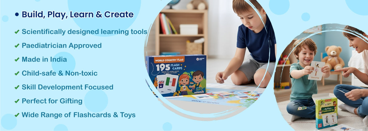 We offer educational kids' products like flashcards, toys, puzzles, books, art & craft kits, and AR products for ages 0-6+ years.
